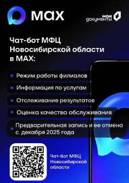 в Новосибирской области реализуется комплекс мероприятий по популяризации функционального сервиса чат-бота МФЦ на платформе МАХ (далее – чат-бот МФЦ). - чат-бот МФЦ Новосибирской области в МАХ: https://max.ru/mfc_nso_max_bot
